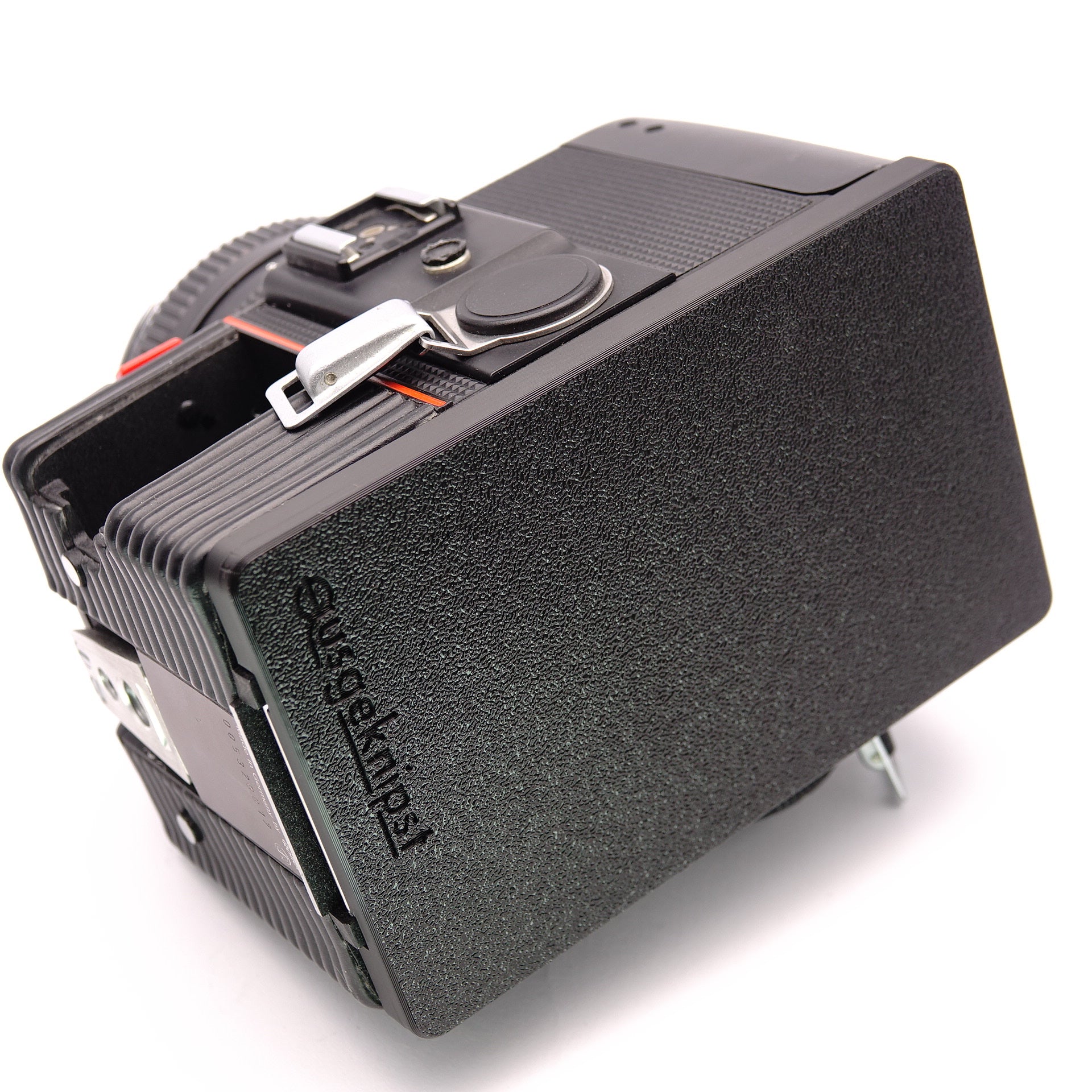 This camera back cover is essential to protect the inside of your Rolleiflex system camera as soon as the film magazine is not mounted. The handling is simple and corresponds to the function of the original: The cover is inserted at the bottom into the hinge and then locks firmly at the top, so the camera can be safely stored or carried.